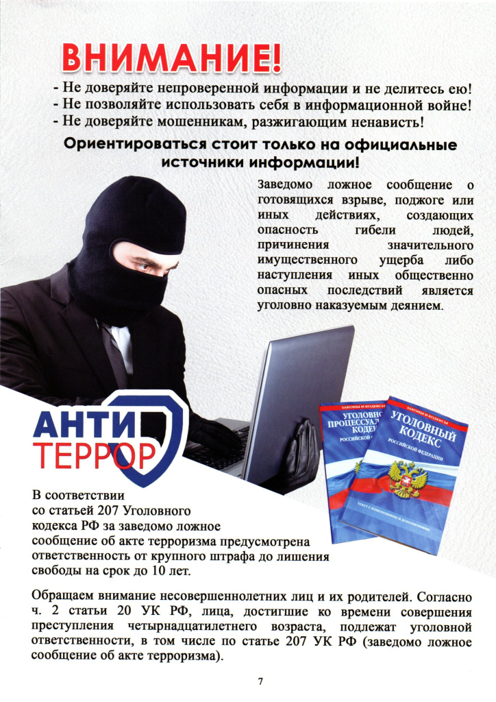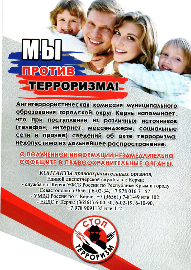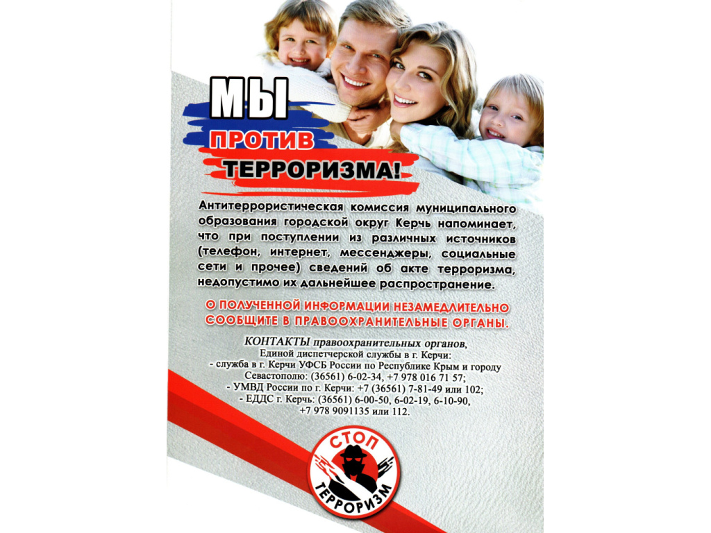 Антитеррористическая комиссия муниципального образования городской округ Керчь напоминает, что при поступлении из различных источников (телефон, интернет, мессенджеры, социальные сеты и т.д.) сведений об угрозе совершения террористического акта, недопустимо их дальнейшее распространение. При этом необходимо незамедлительного сообщить о полученной информации в правоохранительные органы любым доступным способом (телефон, личный визит):