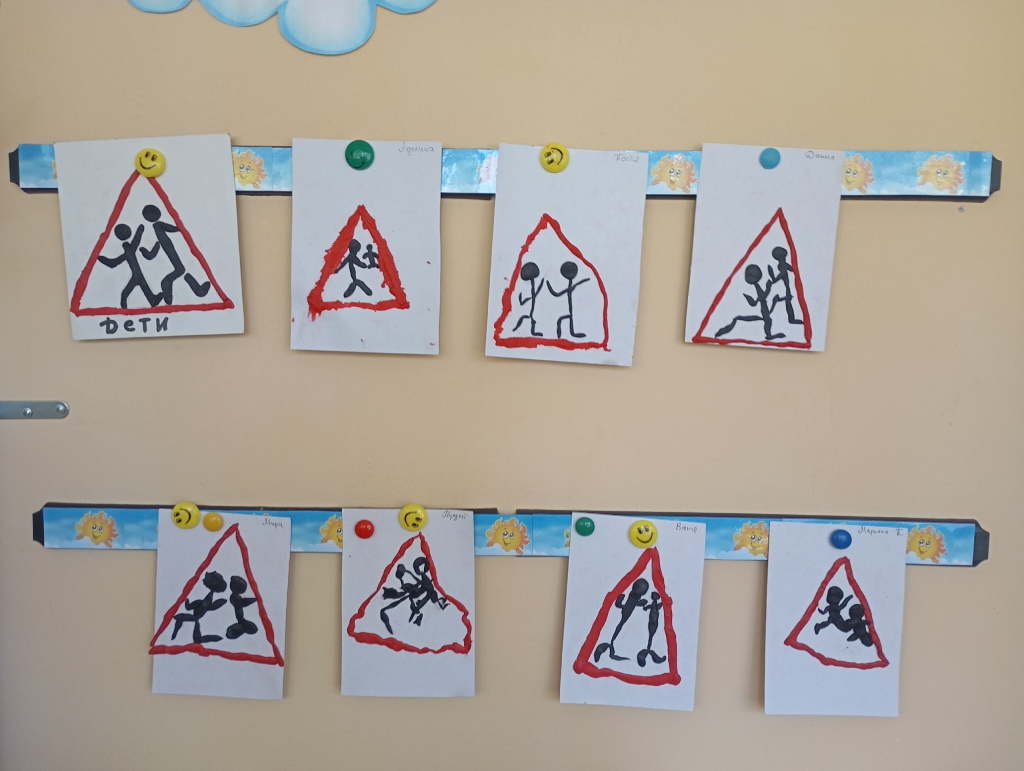 Знакомили детей с дорожными знаками: указательными («Пешеходный переход», «Подземный пешеходный переход»); запрещающими («движение пешеходов запрещено», «Движение на велосипедах запрещено»); знаками сервиса («Больница», «Пункт питания»)